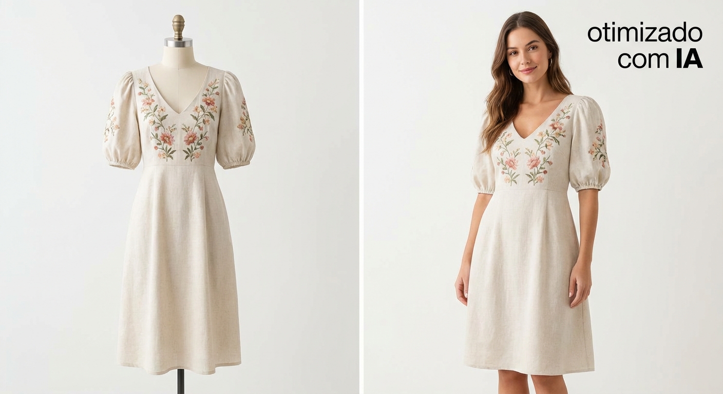 A mesma peça: à esquerda, foto original no manequim. À direita, foto otimizada com IA mostrando uma modelo vestindo o produto. Sem estúdio, sem fotógrafo — só a IA.